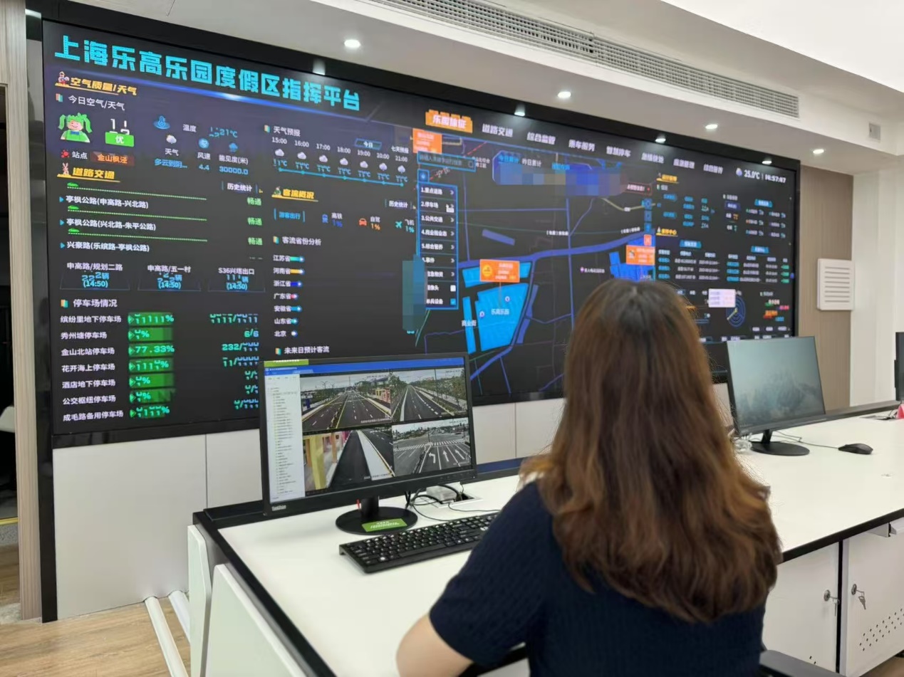 在试运营期间,乐园迎来了众多游客。系统数据显示,部分关键路口出现了车流高峰。当人工智能分析显示达到拥堵预警时,指挥中心迅速派出人员前往现场疏导交通,确保车辆顺利进入度假区。
